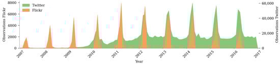 The first two case studies show a mix of ecological, technological, and social dynamics in data patterns. Is this always the case? To illustrate the impact of a single phenomenon across multiple platforms, we considered observations of cherry blossoms (E) shared on Twitter and Flickr. Our hypothesis is that, under certain circumstances, global communication should be closely linked to actual ecological change. Cherry blossoms can be seen as one of the many phenomena that Hull and McCarthy [] categorized under landscape change (see Literature review). Our expectation was that the regularity and seasonal appearance of cherry blossoms each spring should allow us to better observe changes in patterns related to the other two SETS dimensions. For example, cultural changes (S) could lead to a steady increase in perceived importance that is visible online (T); or unexpected fluctuations in the regularity of reactions could draw attention to trends and events not captured so far. Figure 4 illustrates the global volume of tweets and Flickr photographs that contain references to cherry blossoming from 2007 to 2018. For both Flickr and Twitter, we used the same query to semantically filter content: