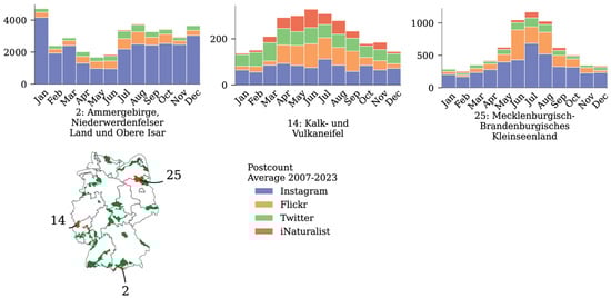 As becomes obvious, comparing data from multiple platforms is particularly useful for identifying and separating technological (T) impacts from ecological (E) and social (S) phenomena. To illustrate this utility, our next case study explicitly aimed to collect data from many platforms and for a variety of regions of scenic interest. Using data from Flickr, Twitter, iNaturalist, and Instagram, we examined the variance in seasonal user frequency for five platforms and for 30 biodiversity hotspots in Germany (see Appendix A, Figure A3). Figure 5 shows a subset of three hotspots as stacked frequency bar plots. All hotspots show divergent patterns, with user frequency varying significantly over the year and across platforms. For example, the “Ammergebirge, Niederwerdenfelser Land und Obere Isar” (Hotspot 2) appears to be a popular holiday destination at the turn of the year and for Instagram (e.g., winter sports tourism). At the same time, this region shows a relatively constant flow of visitors across all platforms in all seasons. In contrast, the “Limestone and Volcanic Eifel” (Hotspot 14), a region known for its attractiveness for nature lovers and hikers, seems to attract a disproportionately high number of animal and plant observers, especially in summer (iNaturalist), according to our data. Other regions, such as “Mecklenburg-Brandenburgisches Kleinseenland” (Hotspot 25), are primarily characterized by summer tourism. Many of the remaining hotspots, available in Appendix A, Figure A3, can also be assigned to these three categories. In our data, Twitter and Instagram tend to show the least variation in frequency throughout the year. In comparison, iNaturalist and Flickr users seem to share more data, relatively speaking, during the summer months.