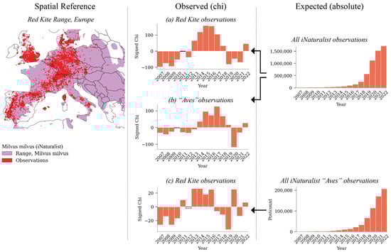 Applying this normalization allows analysts to distinguish properties of filtered subsets of data from phenomena or biases found in the entire data set []. The two components can also be described as a generic query (expected) and a specific query (observed). A specific query might be the frequency of photographs related to a particular topic or theme (e.g., all photographs of the Red Kite). A generic query, on the other hand, ideally requires a random sample of data. Observed and expected values are usually evaluated for individual “bins”, which can be spatial grid cells or temporally delimited time periods or intervals. Based on the global average ratio of frequencies between observed ( and expected (, individual bins are normalized (norm). Positive chi values indicate overrepresentation and negative values indicate underrepresentation of observations in a given area or time interval (). The randomness of the generic query is typically difficult to achieve due to the opaque nature of APIs. For example, it is not always clear how data have been pre-filtered by algorithms before being served to the user []. The easiest way to ensure randomness is to sample all data from a platform. For Flickr and iNaturalist, this was possible, and all geotagged photos and observations were queried for the period from 2007 to 2022. The resulting dataset we use for “expected” frequencies consists of metadata of 9 million iNaturalist observations. Observed frequencies are based on 22,075 Flickr photos and 20,561 iNaturalist observations. All data and code used to generate the graphs are made available in a separate data repository [].