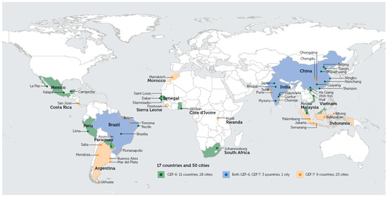 The paper synthesizes experiences from projects and initiatives in cities across the world, specifically those under the Sustainable Cities Program of the Global Environment Facility (GEF-SCP). The GEF-SCP was launched in 2016 to address the growing interest from developing countries to tackle multiple challenges emerging from rapid urbanization. It was designed to promote an integrated and system-based approach to urban transformation, with an initial cohort of 11 country-level projects covering 28 cities in Africa, Asia, and Latin America. The cities were supported to develop innovative sustainability solutions and strengthen institutional capacity to build resilience and tackle urgent urban challenges of climate change, biodiversity loss, land degradation, and pollution. An additional cohort of 23 cities was added through a second program in 2020, bringing the total to 50 cities in 17 countries (Figure 1). The cities are connected through a global knowledge and coordination platform [22,23] and take a programmatic approach to ensure that the results coming from individual investments are more than the sum of the parts. A new funding phase is underway, which will increase the number of cities and scale up integrated urban approaches.