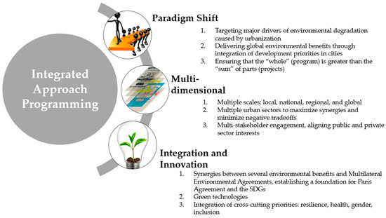 The environmental challenges related to high GHG emissions, loss of natural resources, climate vulnerability and pollution are interconnected in urban systems with direct implications on social and economic aspects. Therefore, urban planners and experts have long been advocating for integrated approaches to tackle urban sustainability challenges in a coherent manner through integrated urban planning, cross-sectoral solutions, and multi-level governance, going beyond siloed sectoral approaches. Integrated urban planning considers interrelationships among housing, transportation, economic development, education, environmental sustainability, inclusivity, and other policy areas, including climate change [74]. Cross-sectoral solutions and approaches enable cities to factor in synergies and trade-offs of sustainability solutions with an overall objective of delivering well-being and effectiveness of solutions. Multi-level governance enables cooperation between national ministries and departments with their respective sectoral or thematic function and local governments to align plans, investments, and goals to achieve a wide set of sustainability goals at local, national, and global levels. These dimensions formed the basis of the GEF’s Sustainable Cities Integrated Approach Pilot program, which was conceptualized and launched in the GEF-6 financing period (2014–2018) with the objective of delivering multiple and large-scale global environmental benefits. As naturally integrated systems, cities were in the right position to adopt this integrated approach to urban planning and signaled a paradigm shift to use GEF funding from single sector and focal areas to integrated and systems-based programs.