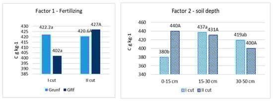 Concentration of C in root biomass. Note. I—plant root mass studies were carried out during the flowering stage of grasses (the third ten days of June); II—after the last grass cutting (the third ten days of September). Lowercase letters indicate significant differences (p < 0.05) between the treatments for the I cut, and capital letters indicate significant differences (p < 0.05) between the treatments for the II cut.