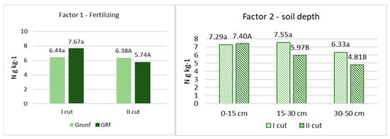 The concentration of N in root biomass. Note. I—plant root mass studies were carried out during the flowering stage of grasses (the third ten days of June); II—after the last grass cutting (the third ten days of September). Lowercase letters indicate significant differences (p < 0.05) between the treatments for the I cut, and capital letters indicate significant differences (p < 0.05) between the treatments for the II cut.