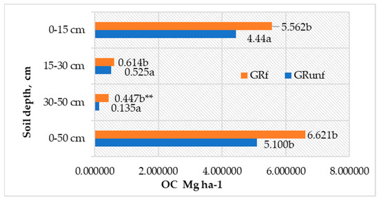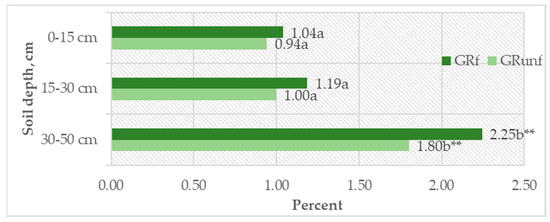 C accumulation in roots of perennial grasses in Arenosol profile. GRunf—grassland unfertilized; GRf—grassland fertilized. Note. Lowercase letters indicate significant differences (p < 0.05) between the treatments ** indicates significant differences (p < 0.01).