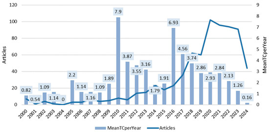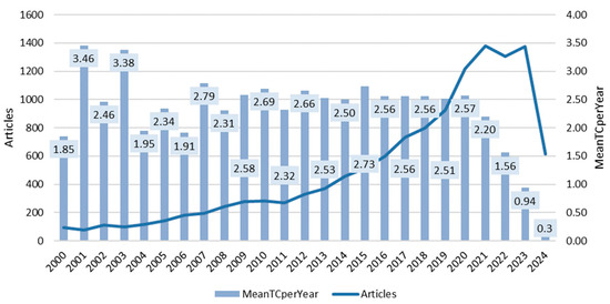 Both databases were merged to process the information jointly using Biblioshiny package functions. In this process, only relevant data from Web of Science (WoS) were retained in case of duplicate references. A total of 1601 duplicates from the global search and 50 duplicates from the EU search were removed. The results of the final data importation (5 July 2024) are presented in detail in Table 1 and Table 2, corresponding to the global and European-level searches, respectively.