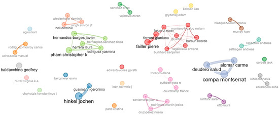 Regarding the collaboration network analysis, within the scope of the European domain (Figure 3), this segmentation reflects the different geographical and thematic areas on which researchers from the European Union focus in the study of insularity. Key clusters include Hernandez-Borges et al. (green), focused on marine ecology and biodiversity and Ferraro et al. (red), centered on environmental economics and policies. Notable clusters also include Alomar et al. (blue), emphasizing marine pollution studies, and Hinkel et al. (dark blue), addressing climate adaptation and risk management. Inter-cluster connections suggest interdisciplinary collaboration, with authors such as Jochen Hinkel and Godfrey Baldacchino bridging sustainable development and planning themes. The diverse and collaborative nature of this network highlights the multifaceted approach necessary to tackle complex issues in island research.
