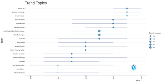 The analysis of global trends over the past 10 years, as depicted in Figure 4, reveals that initial research focused on aspects related to phylogeography, speciation and microsatellites (2015–2017). From 2017 onwards, issues concerning invasive species and genetic diversity of island territories have arisen. In 2020, tourism emerged as the main issue, highlighting the challenges stemming from the COVID-19 pandemic and the high dependence of islands on this sector [40]. The concept of small island developing states also gained prominence from 2020 onwards. Recently, there has been an observed shift towards themes associated with four key topics: biodiversity, conservation, sustainable development within the framework of the circular economy, and finally, the COVID-19 pandemic. Geographically, the Canary Islands stand out in global research on insularity.