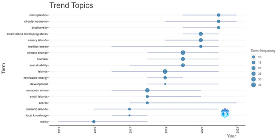 Following the need to delve deeper into the study of islands [27], this proposal aims to address the bibliometric research gap regarding insularity from geographical, environmental, economic and social perspectives. The conceptualization and definition of the concept have been worked on, as authors such as [28] have analyzed the intersection between law, geography and fiction in the context of islands and insularity from a legal standpoint. The redefinition of the island as a small island space has also been proposed, along with different typologies of insularity and “islandness” or isolation from a geopolitical perspective [2,6]. Other related concepts, such as remoteness and isolation, have been delineated from a linguistic perspective [3]. Furthermore, in similar studies [29], the concepts of “island landscape” and “small island” have been defined from an ethnographic and geographical viewpoint. From a geopolitical sense, the concept of island as a “political interstice” [30] has been debated. In parallel, recent research has proposed innovative statistical methodology for measuring insularity [18]. Other works include surveys as a review of theoretical and empirical evidence on the impact of insularity on regional economic development [31]. The most recent bibliometric analysis explores research on tourist clusters and island economies [32].