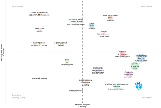 • Thematic map: Each cluster or theme is represented on a thematic map, where centrality and density are measures of relevance and development of the theme, respectively. More specifically, centrality is the degree of correlation among different topics; density measures the cohesiveness among the nodes [36,37]. Based on these two parameters, themes are divided into emerging or declining (low centrality, low density), basic and transversal (high centrality, low density), specialized and isolated (low centrality, high density) and driving or core themes (high centrality, high density). It is worth noting that, in some cases, synonyms have been grouped to facilitate grouping into coherent clusters (e.g., small island developing state and small island developing states). The applied methodology involves applying a clustering algorithm to a network of keywords to highlight the different themes of a given domain. The walktrap algorithm is highly regarded in bibliometric analysis for identifying tightly-knit groups within large networks, since it uses random walks to detect clusters, enhancing its efficiency in managing complex networks compared to other methods [38,39].