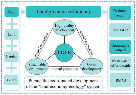LGUE is a new land use model after land intensive use and land sustainable use, which mainly refers to the optimal combination of land, economy, resources, and environment under the current development level and constraints [13]. The essence of LGUE is to maximize green economic benefits at the cost of minimal land resources and environmental losses [12]. The LGUE measurement not only includes the output of traditional economic factors, but also needs to include undesirable outputs such as ecological loss and environmental pollution [41]. According to the connotation of LGUE, the input–output indicators selected in this study were as follows [10]: 1. Input indicators: land resource input was expressed by urban construction land area; labor input was expressed by urban employment personnel; capital investment was expressed by the total fixed asset investment; 2. desirable output: real GDP was taken as the desirable output; and 3. undesirable outputs: based on the input–output nature of factors, wastewater, sulfur dioxide, and PM2.5 emissions were used as undesirable output indicators (Figure 1).