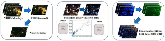 In addition, considering the strong detection ability of NPP–VIIRS, this study used 0.3 as the threshold to remove noise in NPP–VIIRS images, and assigned pixels with negative DN values to 0 [44]. Finally, the 2013 overlapping images were used to conduct DN value correlation analysis, and NPP–VIIRS was fitted to DMSP–OLS data. Table 2 shows that the R2 of the power function was larger (0.8472), and the fitting effect was better. Therefore, this study used a power function to convert NPP–VIIRS light data from 2013 to 2020 into DMSP–OLS-like data (Figure 2).