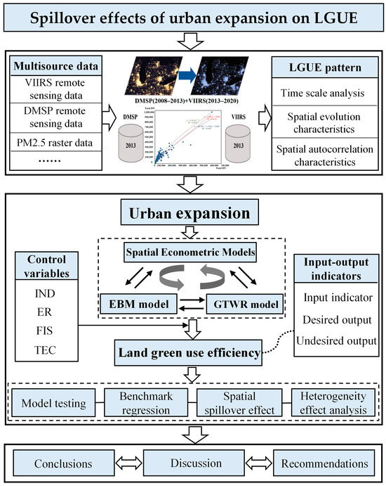 On the basis of theoretical analysis, this study combined multi-source remote sensing data and economic and social attribute data, and also combined ArcGIS spatial analysis and spatial econometrics models, to explore the spatial effect of urban expansion on LGUE (Figure 3).