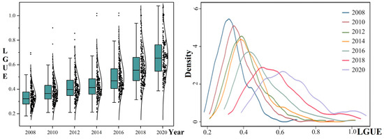(1) During the study period, LGUE in Chinese cities had certain gradient distribution and spatial dependence characteristics, and the LGUE in some cities was generally low, indicating that structural imbalance and extensive abuse still exist in the land use process. However, the kernel density curve of LGUE gradually shifted to the right, and the peak value continues to decrease, reflecting that the absolute difference in LGUE between cities has gradually shrunk, and LGUE has increased, over time.