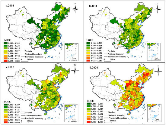 Spatial distribution characteristics of LGUE. (a) Spatial pattern of LGUE in 2008; (b) spatial pattern of LGUE in 2012; (c) spatial pattern of LGUE in 2016; and (d) spatial pattern of LGUE in 2020.