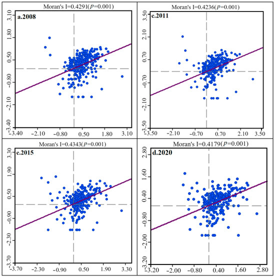 Based on the GeoDa1.14 analysis software and global Moran’s I, this study explores the spatial autocorrelation characteristics of urban LGUE from 2008 to 2020 (Figure 6). During the study period, the global Moran’s I of LGUE fluctuated between 0.4179~0.4343 (p = 0.001), indicating that LGUE has strong spatial dependence characteristics. On the one hand, the geographical environment, topography, and other natural conditions of geographically adjacent cities are relatively similar, resulting in their land types and land quality being basically the same. On the other hand, cities with similar economies and industries have relatively consistent land use structures and intensity, resulting in LGUE having strong spatial autocorrelation characteristics. Therefore, only by continuously narrowing the gap in economic and industrial development and promoting the free flow of factors can we accelerate the spatial connection between cities of different levels and promote the efficient and coordinated development of LGUE.