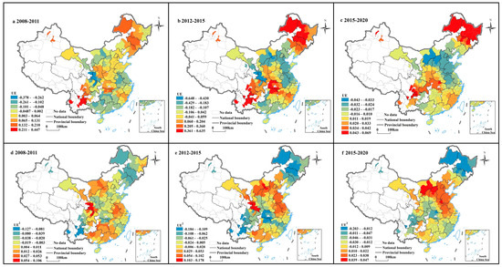 This study uses the GTWR model to reveal the spatiotemporal heterogeneity effects across three time periods: 2008–2011, 2012–2015, and 2016–2020 (Figure 7). Figure 7a–c show that urban expansion had a significant positive spatial effect on LGUE in the northeastern and central and western regions from 2008 to 2020, but had a certain negative spatial effect on the Yangtze River Delta and Pearl River Delta urban agglomerations. As China’s old industrial base, appropriate urban expansion in Northeast China can optimize the industrial structure and functional layout, promote “urban renewal”, and accelerate economic and industrial development. However, the current spatial development policies in developed regions such as the Yangtze River Delta have not significantly improved the efficiency of resource allocation nor increased income per unit land area. In particular, the population and industries in some cities are highly concentrated, which has not brought obvious economies of scale and spillover effects; on the contrary, it has intensified the concentrated discharge of pollutants and vicious competition, and weakened the vitality of economic development and green total factor productivity to some extent.