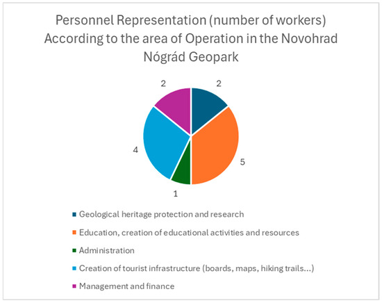 The organization (geopark) has a well-established structure with clearly defined roles, designated governing bodies, and allocated responsibilities. Notably, in the planning process, feedback is actively solicited and utilized to manage and evaluate processes within the geopark, facilitating continuous improvement. Furthermore, the personnel structure is clearly outlined and visualized in the following graph (Figure 3), depicting the distribution of employees across their respective areas of operation.