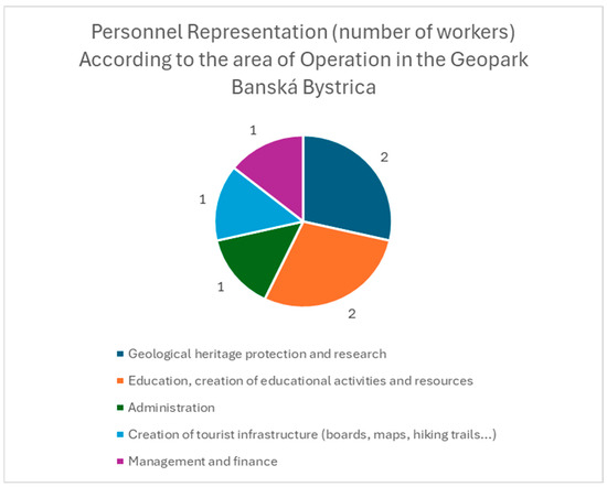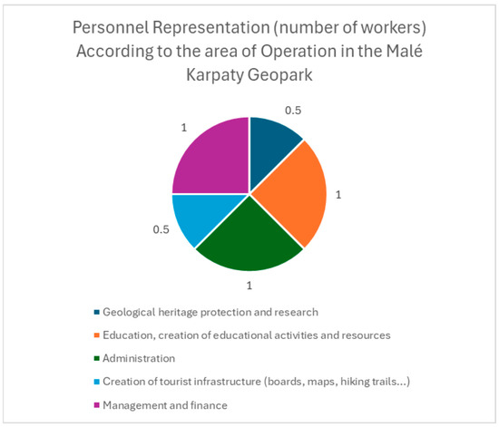 The Malé Karpaty Geopark, the newest addition to the Slovak Geoparks Network, operates under the auspices of the non-profit organization Barbora. Its management boasts a well-established organizational structure with clearly defined competencies overseen by a single individual. In terms of planning, the geopark formulates a long-term strategic development plan spanning 5 to 10 years, complemented by medium-term plans covering 3 to 5 years. However, implementation monitoring and feedback mechanisms are absent, which could improve operational efficiency. Plans encompass financial, marketing, and activity-related aspects. From a legal perspective, the geopark’s workforce structure comprises three permanent employees and one voluntary worker. The graph below (Figure 4) provides insight into the specific operational areas within the Malé Karpaty Geopark, with residents not included in the team structure.