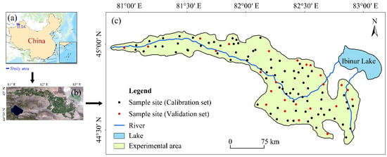 This study was conducted in the Ibinur Lake Irrigation Area (ILIA) of the NW arid zones of China, with an experimental area range of 80°50′–83°00′ E and 44°20′–45°10′ N (Figure 1), which covers an area of 3300 km2. Climate type of the experimental area belongs to the temperate continental dry climate, with an annual average precipitation of 105.27 mm, 80% of which is mainly concentrated from June to September. The annual average evaporation reaches 2221.3 mm, and the annual average temperature is 7.8 °C. Main soil types in the ILIA are irrigation desert soil, sandy soil, saline soil, and calcareous soil [24].