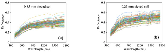 The original soil spectral reflectance curves processed through S-G smoothing. (Each line represents the spectrum of the soil sample (n = 106)). (a) 0.85 mm sieved soil; (b) 0.25 mm sieved soil.