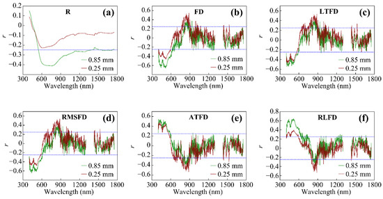 The correlation between the soil spectral reflectance (including the original and mathematically transformed spectral reflectance) and SOM content of the collected soil samples was analyzed (Figure 3). It can be seen that the SOM content exhibited relatively weak association with the original spectral reflectance (R) of both the 0.25 mm sieved soil (r = −0.227, at the weak correlation level) and the 0.85 mm sieved soil (r = −0.415, at the moderate correlation level) (Figure 3a). As for the original spectral reflectance, the 0.85 mm sieved soil exhibited better correlation with SOM content compared with the 0.25 mm sieved soil. It is evident that the original spectral reflectance curve of the 0.25 mm sieved soil does not meet the correlation test threshold of ±0.248. The original spectral reflectance of soil, especially the 0.25 mm sieved soil, had poor performance in the correlation between SOM content of farmland soil in the ILIA.