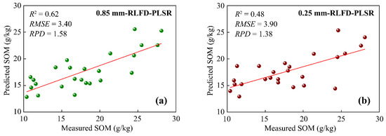 Comparison of the measured and predicted values of SOM content by PLSR modeling. (a) 0.85 mm-RLFD-PLSR; (b) 0.25 mm-RLFD-PLSR.