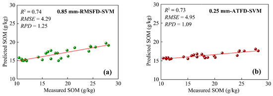 Comparison of the measured and predicted values of SOM content by SVM modeling. (a) 0.85 mm-RMSFD-SVM; (b) 0.25 mm-ATFD-SVM.
