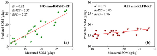 Comparison of the measured and predicted values of SOM content by RF modeling. (a) 0.85 mm-RMSFD-RF; (b) 0.25 mm-RLFD-RF.
