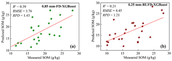 Comparison of the measured and predicted values of SOM content by XGBoost modeling. (a) 0.85 mm-FD-XGBoost; (b) 0.25 mm-RLFD- XGBoost.