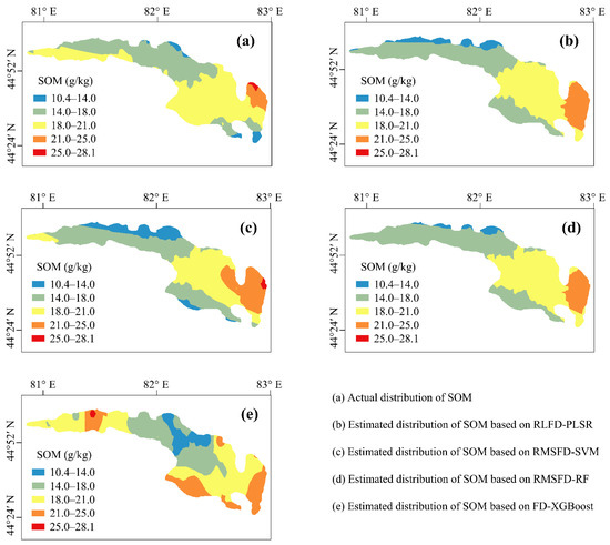 Based on the measured and predicted SOM content, the actual distribution and the estimated distribution patterns of SOM content based on the selected PLSR, SVM, RF, and XGBoost methods were mapped using the Ordinary Kriging (OK) interpolation method and geostatistical analysis method (Figure 8).