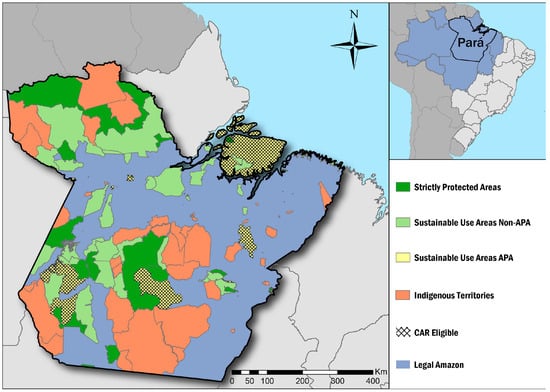 Figure 1. Protected areas within the state of Pará stratified by category—Indigenous Territories, Strictly Protected Areas, Sustainable Use Areas classified as Área de Proteção Ambiental (APAs), and all other Sustainable Use Areas—and eligibility to declare properties in the Rural Environmental Register (CAR). Inset showing the Legal Amazon and the state of Pará.