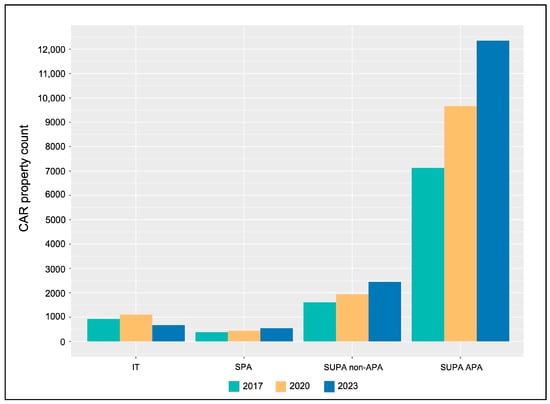 Figure 2. CAR-registered property count in 2017, 2020, and 2023 for each protected area category, Indigenous Territories (ITs), Strictly Protected Areas (SPAs), Sustainable Use Areas (SUPAs) classified as Área de Proteção Ambiental (APAs), and all other SUPAs in the state of Pará.