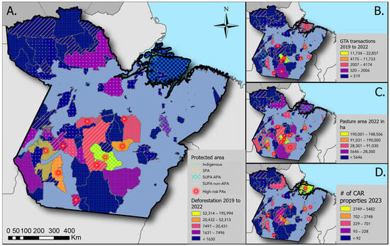 Figure 3. (A) Protected areas (PAs) in the state of Pará classified according to the amount of deforestation (ha) during 2019–2022; (B) number of registered cattle transactions during 2019–2022; (C) amount of area covered by pasture (ha) in 2022; and (D) number of overlapping properties declared in the Rural Environmental Register (CAR) in January 2023. High-risk PAs of each category (top 3 PAs concentrating the most deforestation/GTA/pasture/CAR) are marked in red.