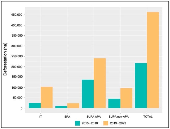 Figure 4. Area that was cleared within protected areas in the state of Pará during 2015–2018 and 2019–2022 stratified by protection category: Sustainable Use Areas classified as Areas de Proteção Ambiental (SUPA-APA); other Sustainable Use Areas (SUPA non-APA); Strictly Protected Areas (SPA); and Indigenous Territories (ITs).