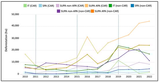 Figure 5. Cleared area (ha) in four different protected area categories—Indigenous Territories (ITs), Strictly Protected Areas (SPAs), Sustainable Use Areas (SUPAs) classified as Área de Proteção Ambiental (APA), and other SUPAs—within CAR-declared properties (2023) and in non-registered areas in the state of Pará during 2010–2022. The dotted lines show the changes in administration.