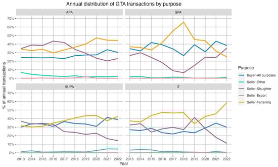 Figure 6. Cattle transactions registered in the GTA by purpose stratified by protected area (PA) category, Indigenous Territories (ITs), Strictly Protected Areas (SPAs), Sustainable Use Areas classified as Área de Proteção Ambiental (APAs), and all other Sustainable Use Areas (SUPAs), for all declared properties in PAs in the state of Pará during 2013–2022.