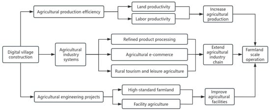 Digital village construction integrates digital technology deeply with the agricultural industry, developing forms of digital agriculture such as precision seeding, variable fertilization, smart irrigation, and environmental control. This integration achieves intelligent, precise, and efficient agricultural production [45,46]. Comprehensive monitoring and timely regulation of crop growth information effectively mitigate the risks posed by uncontrollable external environmental factors like temperature and rainfall. This, in turn, enhances crop yield and quality, ensuring agricultural production benefits [28,39]. Beyond the production process, digital village construction promotes the efficient connection between agricultural producers and the market by advancing agricultural e-commerce. This expansion provides a broader market for the distribution and sale of agricultural products, thereby fostering the establishment of an agricultural industry system that includes production, processing, sales, and distribution, and increases the added value of agriculture [48,49,50]. Consequently, digital village construction transforms the high-risk, low-return nature of agriculture, fundamentally enhancing the attractiveness of the agricultural industry and effectively promoting the process of farmland scale operation. Based on this, Hypothesis 1 is proposed: