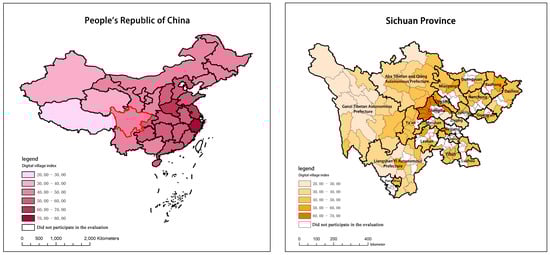 Figure 2 objectively shows that the average level of digital village construction in the western region is lower than in the middle and eastern regions of China. However, there is substantial heterogeneity within the western region. For instance, the 2018 county-level DVI for Sichuan Province used in this study (see Figure 1) indicates that the highest index value is 69.8, within the high development range (60–80), comparable to Guangdong Province’s highest value of 74.2. Conversely, the lowest index value in Sichuan is 22, within the low development range (20–40) and approaching the very low range (0–20). This demonstrates that the sample from Sichuan Province covers all stages of digital village construction, providing a highly representative dataset.