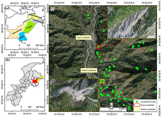 Location map of the Nara and Nokot landslides: (a) Pakistan boundary with the KP administrative boundary, (b) Mansehra and Balakot, and (c) the Nara and Nokot landslides along with other landslide events in the study area.
