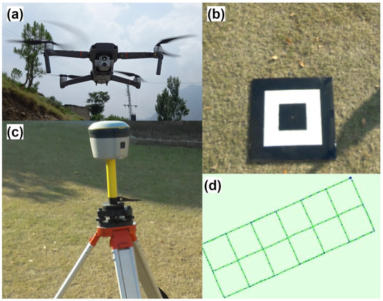 A remotely controlled Quadcopter, i.e., DJI Inspire II and Mavic II Dual Enterprise (Figure 2a) by Da-Jiang Innovations Science and Technology Co., Ltd. (DJI), Nanshan District, Shenzhen, China, was used for mapping the Nara and Nokot landslides. The UAV has a take-off weight of 1.28 kg (camera and battery included for increased stability in the air) with a Xemuse X4 gimbal having a 120° tilt range. The DJI Mavic II Dual Enterprise, Nanshan District, Shenzhen, China, has a take-off weight of 905 g (camera and battery included for increased stability in the air), with a gimbal having a 135 ± 45 tilt range. The gimbal holds the UAV’s camera and harmonizes with the movement of the UAV for image acquisition. Besides this, the Inspire II and Mavic II Dual Enterprise are mounted with ordinary GPS/GLONASS [28], which positions the grid path and takeoff and landing accurately [4]. The visual positioning system (VPS) attached below the UAVs consists of ultrasonic sensors and a monocular camera, which enhances the XYZ accuracies up to 0.1 to 0.5 cm [4]. For this study, we utilized DGPS (Figure 2b) to collect the GCPs (Figure 2c) to enhance the precision of data obtained from the UAV. The wooden tiles of 18 × 18 Inches with black and white painting and the centroid visible in black were used as GCPs. PPS (precise positioning service) mode was used to conduct a geodetic survey to collect GCPs [29,30,31,32]. PPS achieved high accuracy in UAV-based landslide mapping and geodetic surveys for gathering GCPs. First, GPS devices were positioned at selected survey markers and GCP locations, remaining static for an extended period to obtain stable satellite signal data. This initial phase was critical in gathering the raw positional data required for post-processing. The gathered GPS data were then retrieved and analyzed for corrections for various problems, such as air delays and satellite clock discrepancies, by comparing the recorded signals to data from a network of reference stations. The post-processed data had a high level of accuracy, which was critical for the orthorectification of the UAVs orthomosaic and DSMs and ensuring the precision of the landslide displacement analysis. For the UAV survey, the single and double grid missions (waypoint mode) were used in the DJI Go 4 application (Figure 2d). The frontal and side overlap of 85% is used for SfM-based mapping techniques [17,33,34,35]. The ISO was fixed at 100 for noise reduction [36]. The UAV was set to 2 s to capture all images at a 4.6 m/s speed. The data were acquired in April 2019, August 2019, and July 2022.