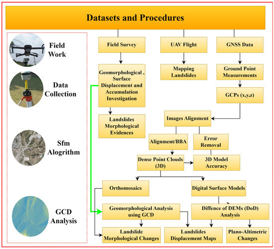 In contrast to spaceborne and airborne remote sensing, UAVs, with their expanding capabilities, provide a wide range of effective applications for landslide mapping and monitoring [5]. UAVs are effective remote sensing platforms capable of producing high-resolution aerial photographs [15]. UAV-derived VHR ortho-mosaic and topographic data are frequently and effectively utilized for the detailed displacement of landslides and monitoring through the analysis of multi-temporal topographic data [16]. To evaluate ground displacement, a variety of tools, i.e., COSI Corr [17], Mic Mac [18], and the differential DSM method [19], have widely been used on satellite images. Geomorphic change detection (GCD) provides a topographic data analysis tool to monitor and measure surface changes using multi-temporal topographic data [20,21]. By generating spatially explicit metrics, including elevation change rates, sediment budgets, and morphological indices, it is effective in identifying and quantifying geomorphic processes, such as erosion, deposition, channel migration, and landform evolution [22,23,24].
