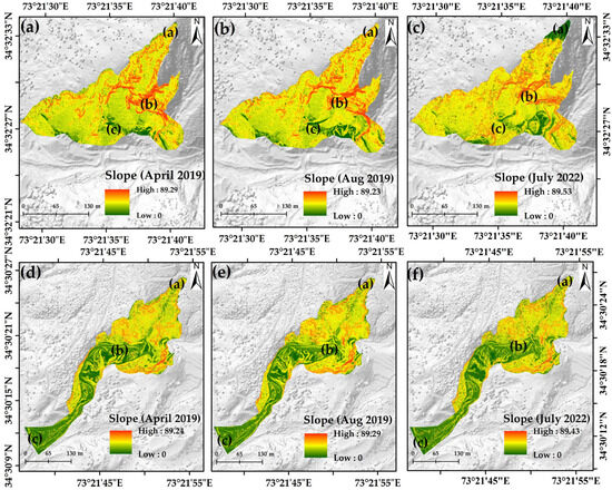The temporal slope maps of the Nara landslide in (a) April 2019, (b) August 2019, and (c) July 2022 and the Nokot landslide for the periods of (d) April 2019, (e) August 2019, and (f) July 2022.