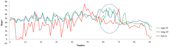 The cross-section AA’s slope changes: Change for the temporal period of April 2019, August 2019, and July 2022 of the Nara landslide, where the Y-axis shows the changing slope values and the x-axis shows the number of points taken along the AA profile used for extracting the slope values from the DSM derived slope data.