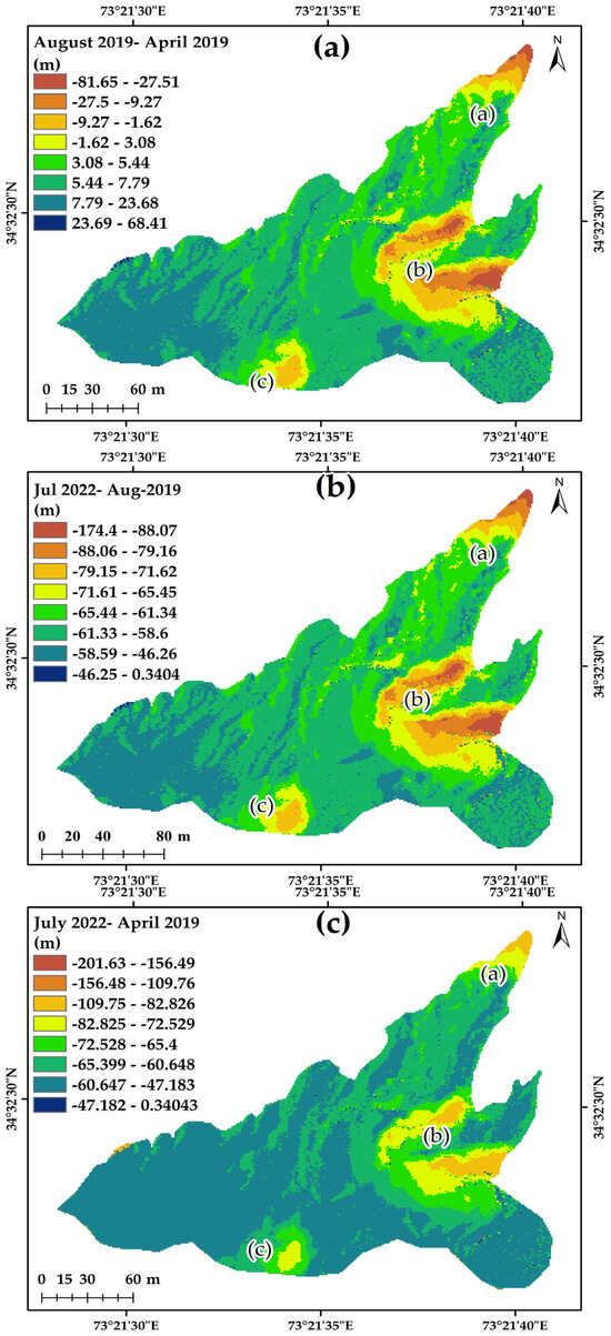 The temporal DSM changes using the GCD for the temporal periods of (a) August 2019–April 2019, (b) July 2022–August 2019, and (c) July 2022–April 2019 of the Nokot landslide.