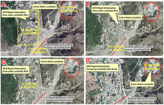 Similarly, Figure 15A presents the community at risk from the Nokot landslides in 2010. Figure 15B–D show the community’s expansion in 2014, 2016, and 2022, respectively, with red circles marking the scarp region’s growth. Additionally, a red line in the toe region indicates the rising water channel draining into the Kunhar River, posing multiple hazards and increased risks to the Nokot village. These figures collectively underscore the growing vulnerability of the communities due to ongoing landslide activity and residential expansion.