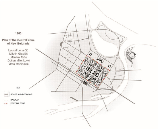 The subject of this research is clearly distinguished both in spatial terms and in its historical formation. The Central Zone of New Belgrade occupies an area of 1600 × 1600 m (around 250 ha) located on a plain at the confluence of the Sava and Danube. Its planning and construction were realised from 1958 to 1979, and it has undergone moderate transformation ever since. It was conceived and structured as the core of New Belgrade, a new and modern part of the city intended to house around 40,000 inhabitants [47,48]. The authors of the first plan were Milutin Glavički, an architect and a prolific urban planner, and Uroš Martinović, an architect, professor, and political protagonist [49], a key figure in the formation of the so-called “Belgrade School of Architecture” [49,50]. The initial plan was developed according to a competition-winning entry in 1958, with the proposal submitted in collaboration with planners from the Urban Planning Institute of Belgrade (Leonid Lenarčić, Milosav Mitić and Dušan Milenković), and made effective through the Conceptual Plan in 1960 and Regulation Plan in 1962 (Figure 2). The distinctive spatial concept was based on an orthogonal urban matrix, with a system of three large central squares (Blocks 24–26), six large residential blocks on the outside (Blocks 21–23 and 28–30), and the monumental central axis stretching from the Presidency of the Government (under construction at that time) to the Railway Station (unexecuted).