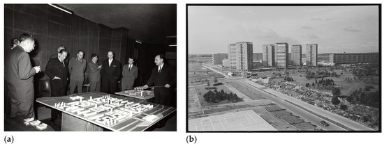 (a) Director of the Urban Planning Institute, Aleksandar Đorđević, shows a model of the CZNBg to President Josip Broz Tito and his collaborators (around 1960); (b) residential towers and buildings in Block 21 located towards the back of an undeveloped central axis of the CZNBg (circa 1965). Source of photographs: Museum of Yugoslavia, Belgrade; photo-archive of Josip Broz Tito, Legacy of Radovan Cukić, 1960_129_048 (a) and Stevan Kragujević, SK_32_A_266 (b).