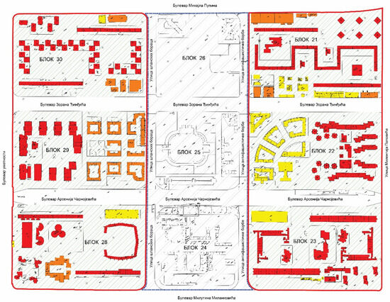 Document issued by the Cultural Heritage Preservation Institute of Belgrade showing the valorisation of buildings of the CZNBg: (1) red—buildings of special value; (2) orange—buildings of value; and (3) yellow—buildings of no value. Source of map: The Cultural Heritage Preservation Institute of Belgrade.