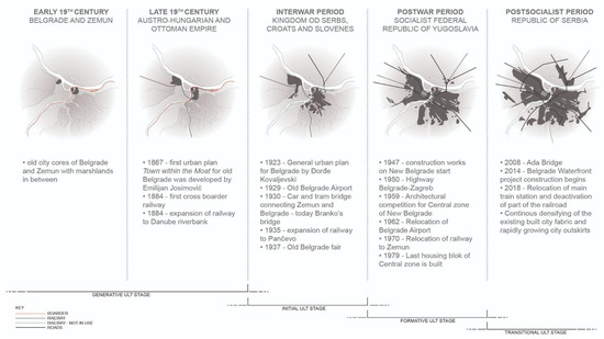 The first generative ULT stage was determined by the borderline dividing the Habsburg and Ottoman Empires, established along the Sava and Danube rivers in Belgrade in 1739. The waterline, as the natural boundary line and the state border for almost two centuries, until the end of WWI, also separated two old city cores of Belgrade and Zemun with marshland in between. Starting with gradual liberation from Ottoman rule, Belgrade’s old historic core underwent the most transformation in the period 1867–1914, executed according to Emilijan Josimović‘s modern regulation plan (1867). The overall transformation of Belgrade at the time was caused by a wide range of issues in the context of the city’s modernisation, which was influenced by European cultural paradigms [35,36].