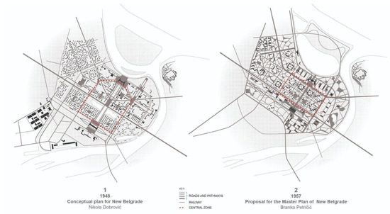 In the 1950s, the initial idea of New Belgrade as a “governing city” was abandoned, and the focus shifted to the fundamental problems of housing. During this period, Branko Petričić authored the Proposal for the Master Plan of New Belgrade (1957), which, as pointed out by Ljiljana Blagojević, was well informed by his practice as an apprentice in the office of Le Corbusier in the 1930s. Furthermore, the turn in the planning of New Belgrade through Petričić’s plan, can be read in its approximation of the basic postulates of the Radiant City, La Ville Radieuse, by Le Corbusier [6] (Figure 5 (2)). The Proposal was eventually abandoned, but his urban plans for housing settlements, experimental blocks 1 and 2, were the first to be realised in New Belgrade. Petričić attempted to synthesise and eventually managed to implement his idea on the “unity of organic and inorganic elements, fused in a functional structure” [78] (p. 228). In his architectural practice, as well as in his theoretical work, Petričić demonstrated deep knowledge and understanding of various aspects of the geographical, economic, and historical positions of Belgrade, as well as great sensitivity to the city’s specific urban problems.
